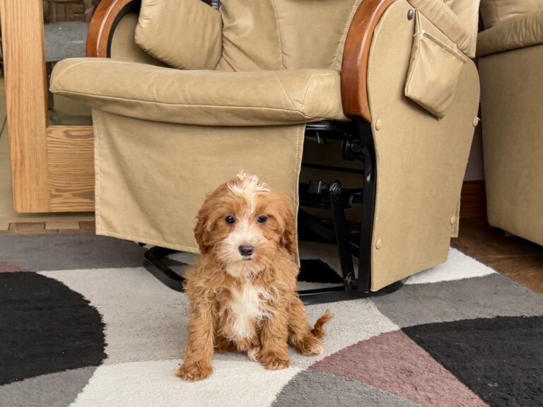 Gorgeous red and white F1 Cavapoo should be 18-20 pounds with a nice easygoing but playful demeanor.